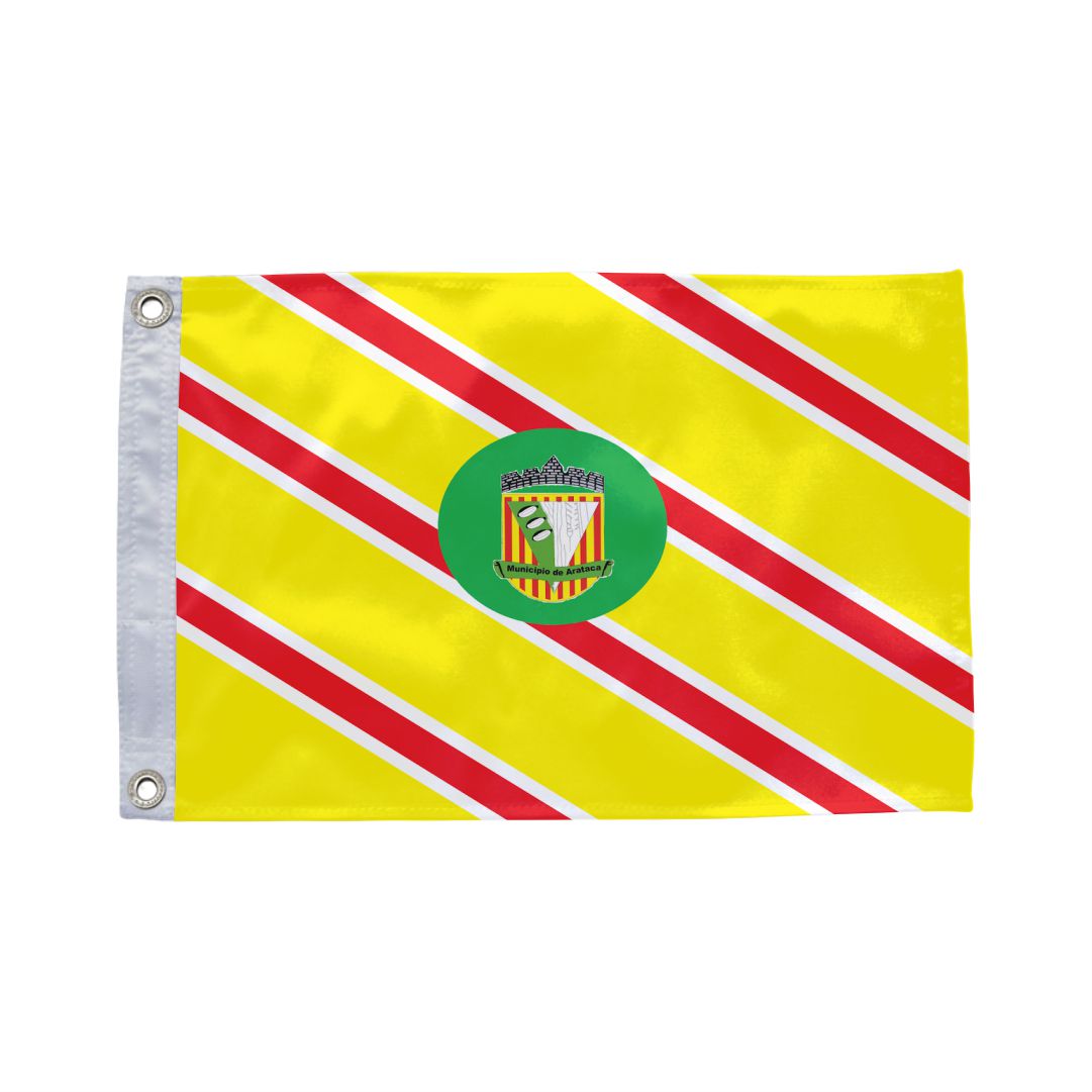 A bandeira de Arataca é composta por faixas horizontais nas cores verde, branco e amarelo, dispostas para representar a harmonia local. Ao centro, o brasão do município simboliza a força da agricultura e a identidade cultural do seu povo.