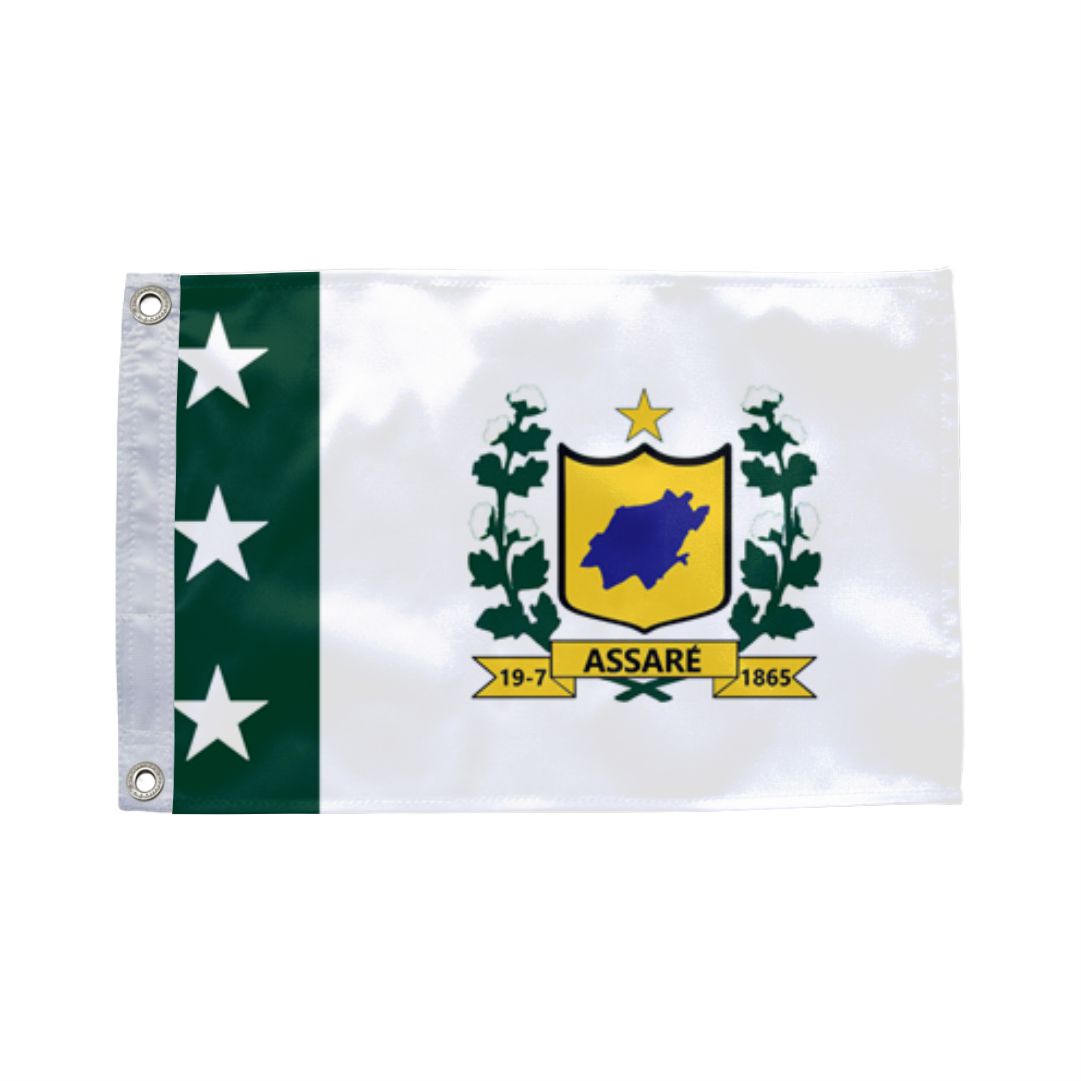 A bandeira de Assaré é composta pelas cores verde, branca e amarela, dispostas em faixas que simbolizam a pujança do campo e a esperança de seu povo. O pavilhão ostenta ao centro o brasão municipal, que sintetiza a identidade histórica e a força produtiva da região.