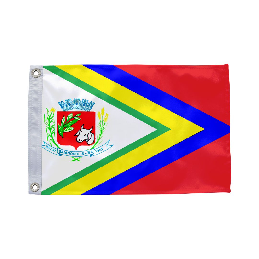 A bandeira de Baianópolis apresenta uma composição que utiliza cores vibrantes dispostas em faixas e elementos geométricos. O design reflete o orgulho cívico e a representação dos recursos naturais e da história administrativa do município.