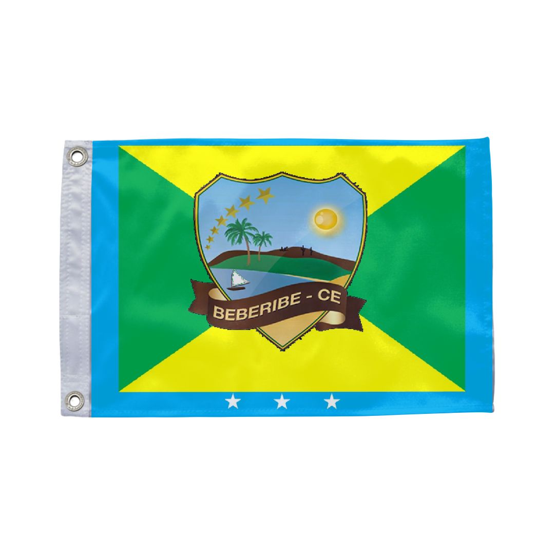 Bandeira de Beberibe (CE) em tecido 100% poliéster dupla face com impressão digital de alta resolução. Ideal para prefeituras, câmaras municipais, escolas e eventos cívicos.