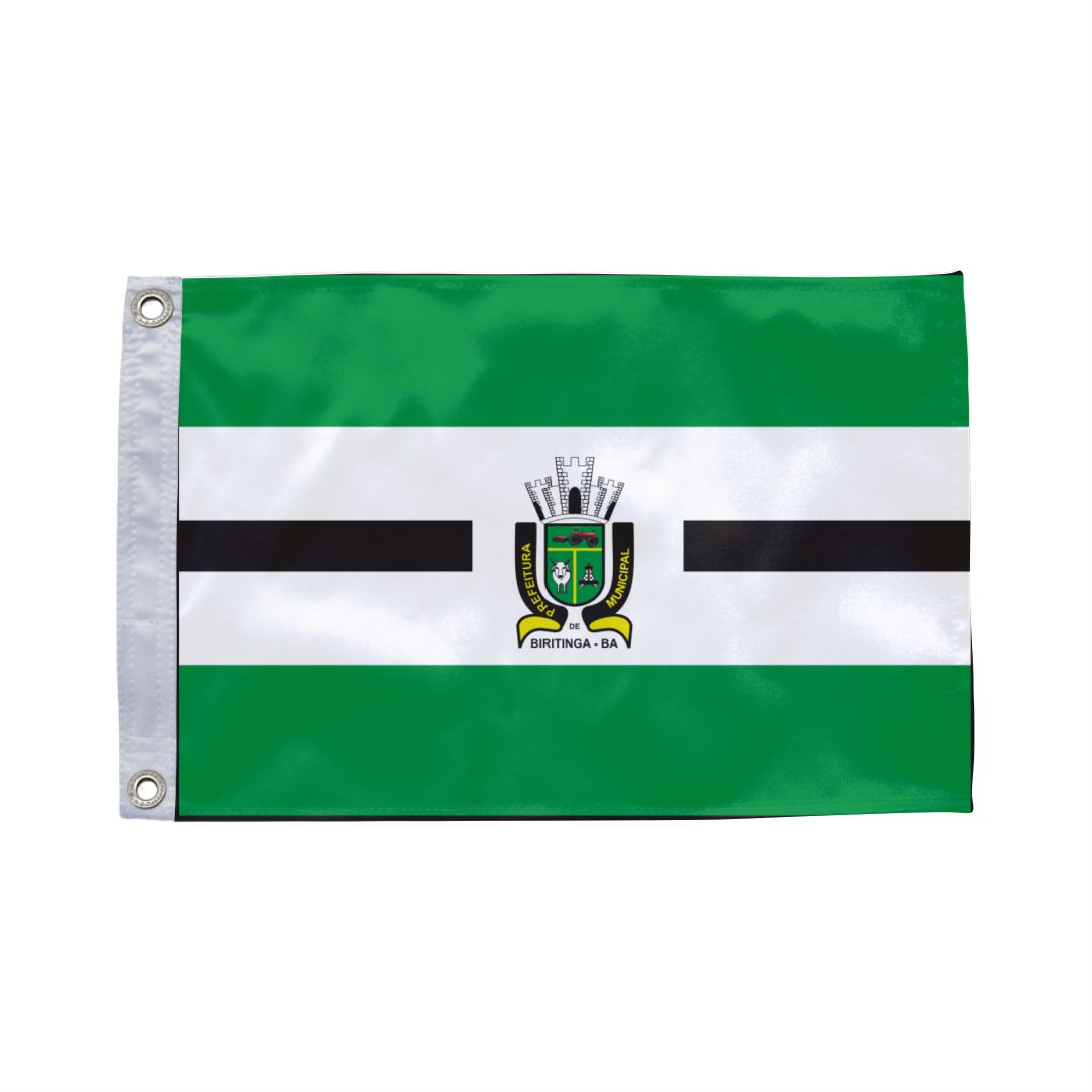 A bandeira de Biritinga é composta por faixas horizontais nas cores verde, branca e amarela, exibindo o brasão municipal ao centro. O design simboliza a identidade local, a esperança do povo e as riquezas naturais da região.