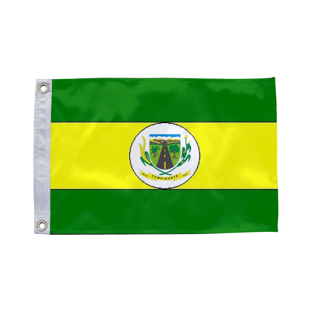 Bandeira de Campinorte (GO) em tecido 100% poliéster dupla face com impressão digital de alta resolução. Ideal para prefeituras, câmaras municipais, escolas e eventos cívicos.
