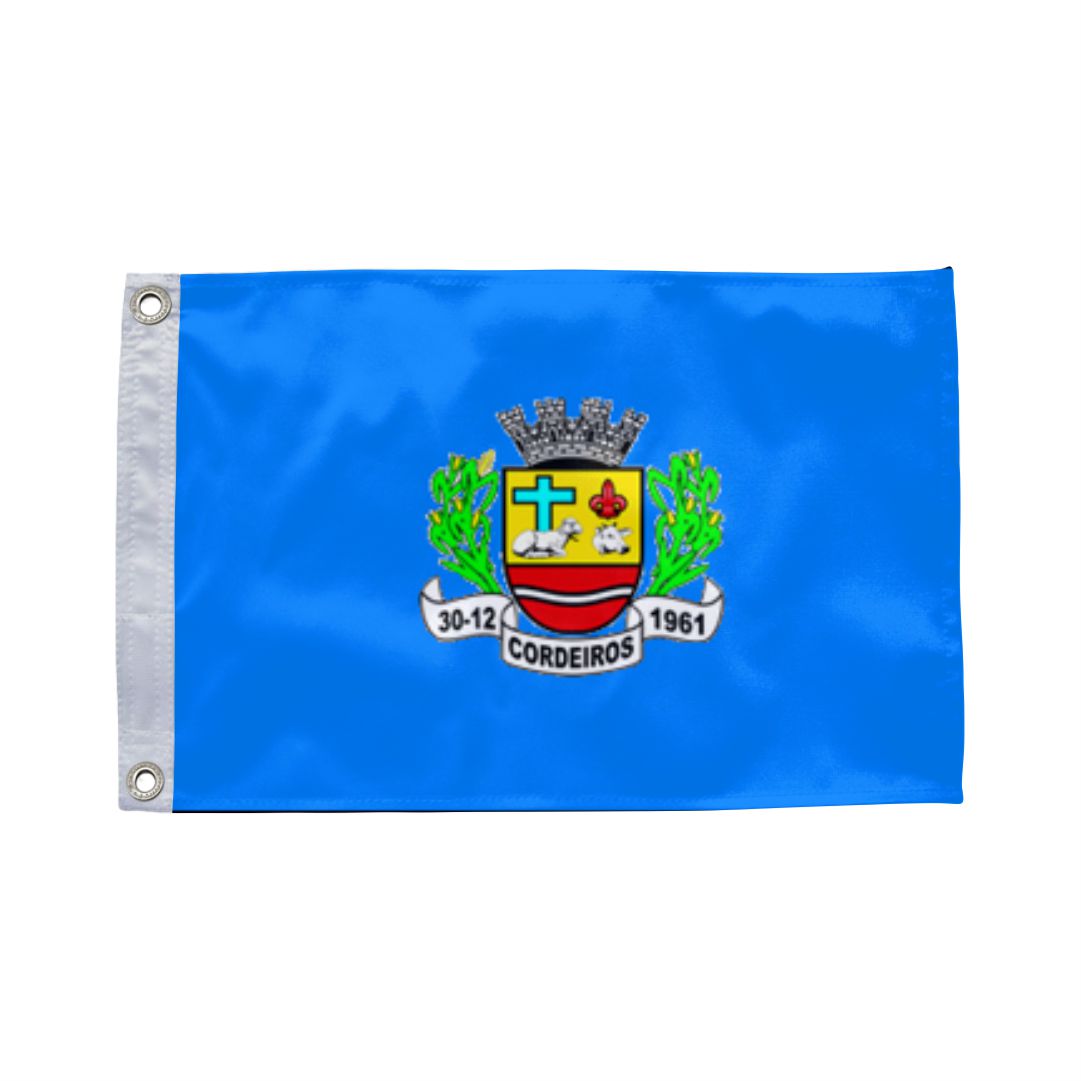 A bandeira de Cordeiros é composta por faixas horizontais que carregam as cores oficiais do município, representando a identidade local. O brasão ao centro simboliza a história, a economia e a integração da comunidade cordeirense.