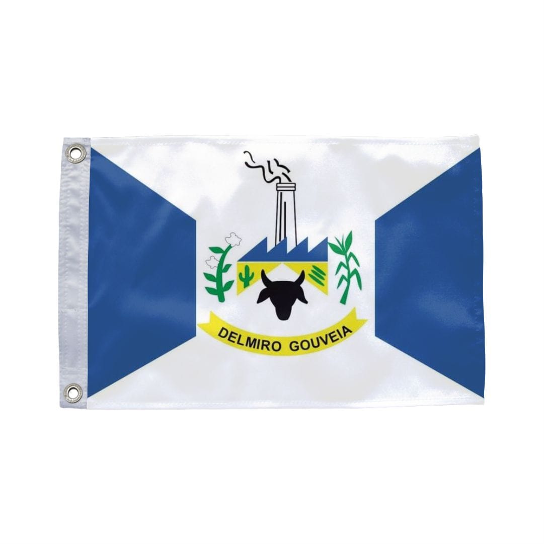 Bandeira de Delmiro Gouveia (AL) em tecido 100% poliéster dupla face com impressão digital de alta resolução. Ideal para prefeituras, câmaras municipais, escolas e eventos cívicos.