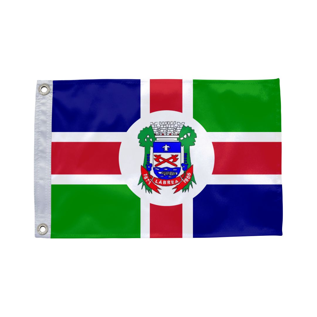A bandeira de Lábrea é composta pelas cores verde, branco e amarelo, dispostas em faixas horizontais com o brasão do município centralizado. Ela simboliza a riqueza das matas amazônicas, a paz e a pujança econômica local.