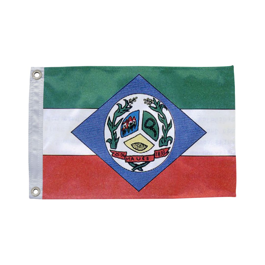 A bandeira de Maués é composta por faixas horizontais nas cores verde, branco e amarelo, ostentando o brasão municipal ao centro. O design reflete a riqueza das matas e o otimismo da população diante das potencialidades naturais da região.