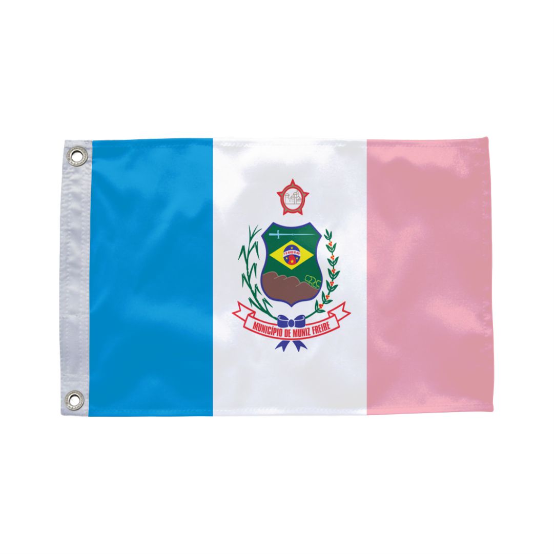 Bandeira de Muniz Freire (ES) em tecido 100% poliéster dupla face com impressão digital de alta resolução. Ideal para prefeituras, câmaras municipais, escolas e eventos cívicos.