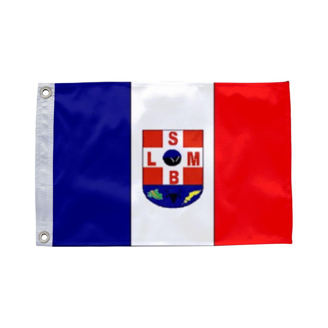 A bandeira de São Luís apresenta faixas horizontais nas cores azul, branca e vermelha, dispostas verticalmente, com o brasão de armas da cidade ao centro. O design reflete a influência histórica e a identidade cultural da capital maranhense.