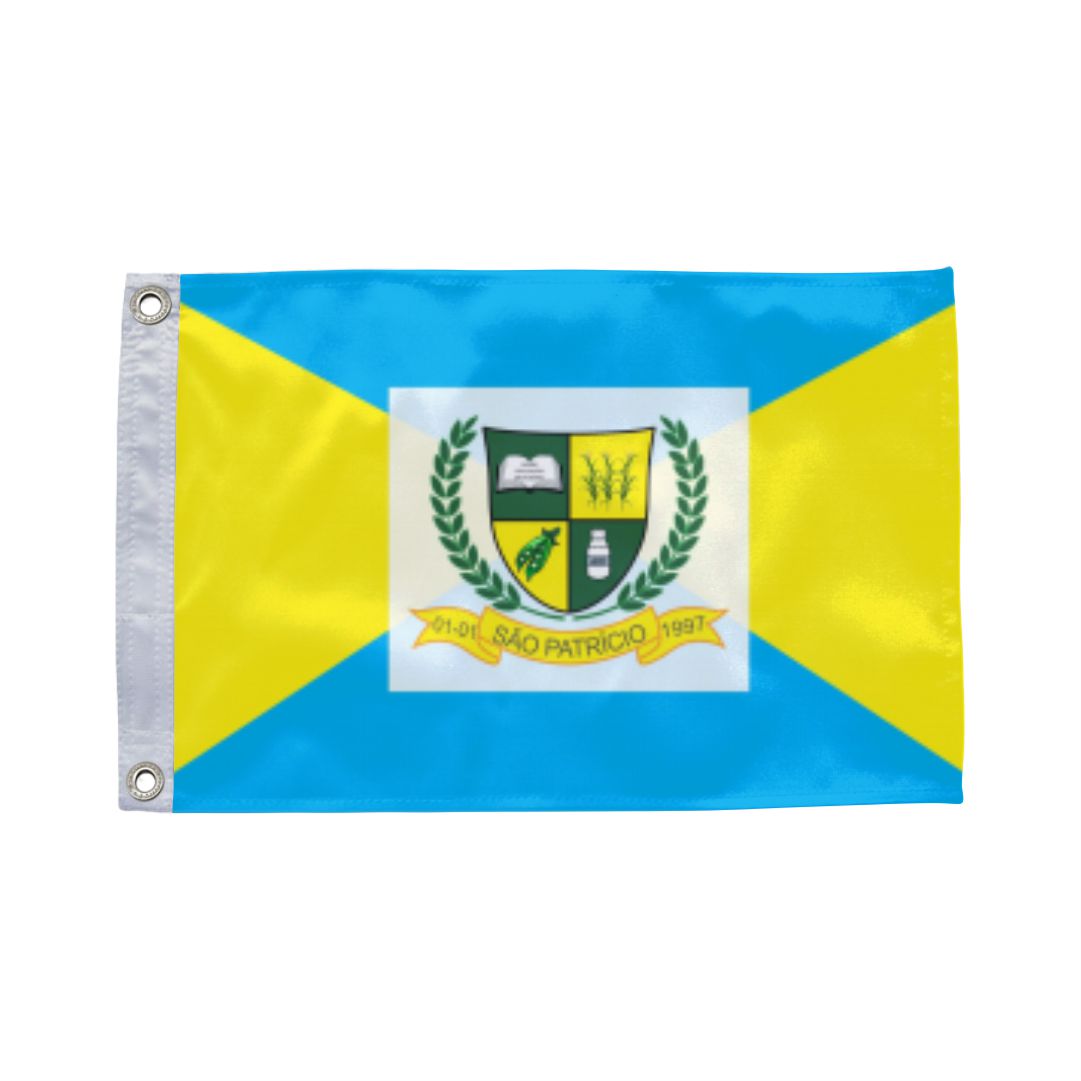 Bandeira de São Patrício (GO) em tecido 100% poliéster dupla face com impressão digital de alta resolução. Ideal para prefeituras, câmaras municipais, escolas e eventos cívicos.