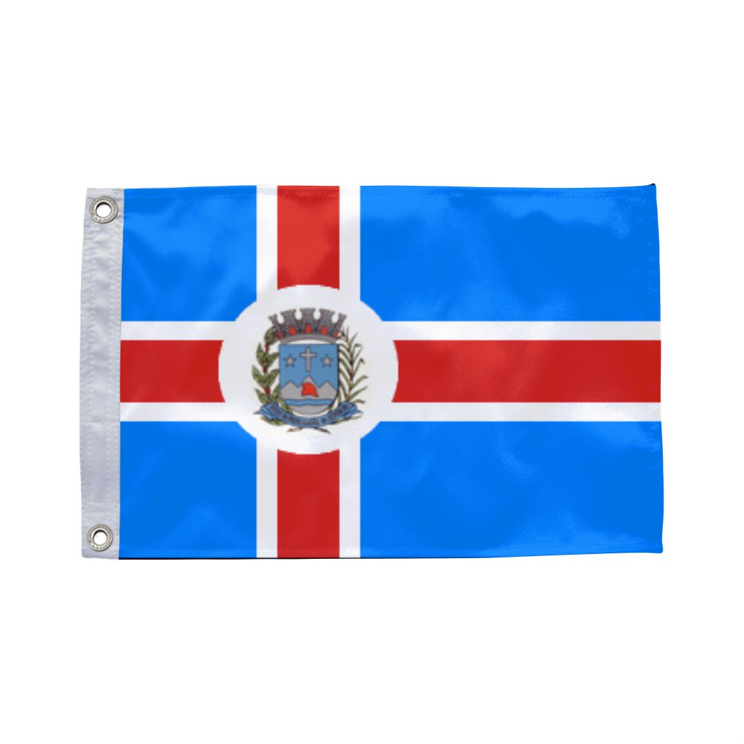 Bandeira de São Simão (GO) em tecido 100% poliéster dupla face com impressão digital de alta resolução. Ideal para prefeituras, câmaras municipais, escolas e eventos cívicos.